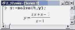 Выше использована процедура solve(). Первым параметром этой процедуры является решаемое уравнение, вторым — переменная, относительно которой уравнение решается. Для ссылки на уравнение использована переменная среды %.