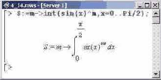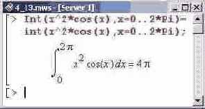 Для вычисления определенных интегралов тоже используется процедура int(). Разница заключается в способе ее вызова: в случае определенного интеграла для переменной интегрирования после знака равенства указывается диапазон ее изменения (конечный или бесконечный). Ниже приведены примеры.