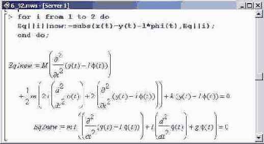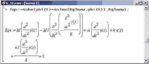 Из последнего уравнения, как нетрудно заметить, можно выразить у) отклонения. Сделаем это (команда solve(Eq2new,phi(t))), и полученное выражение для функции phi(t) подставим в первое уравнение.